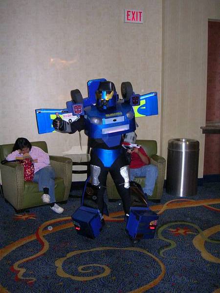 This costume was one of the most elaborate I have ever seen; he was cosplaying as Smokescreen from Transformers. You may not be able to tell but he had neon lights along his lower arms and legs, authentic looking racing sponsor decals on the body, and supposedly he could actually transform in it (although I didn't see it myself). I saw him putting together his costume in the elevator room and it looked pretty darn complicated (about as much as the Gundam cosplayer on Page 2)!