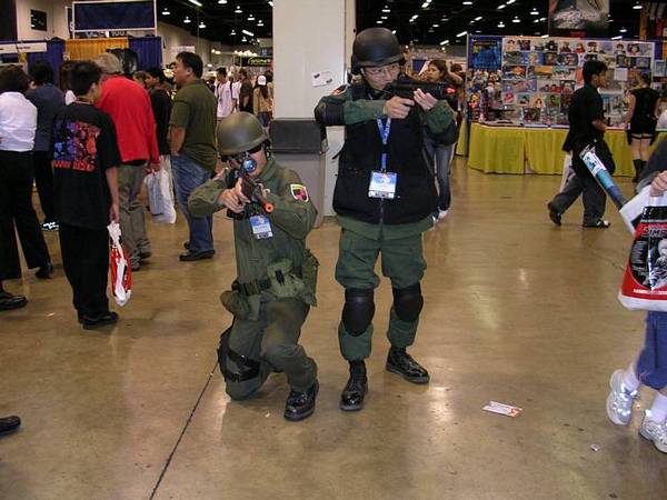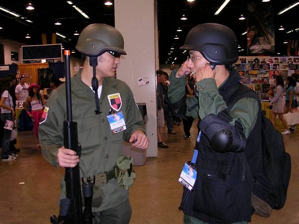 I met this guy earlier when in the parking garage. I wasn't in costume but I ran into him again in the Dealers' Room when I was in costume. In this photo he was asking me about the patch on my uniform. I actually had a lot of people asking me about it. A friend of mine gave me a scan of the unit patch from the limited edition Hellsing volume 2 DVD. I passed it on to a friend of mine serving in Korea. They have a lot of embroidery places that do military patches around the US bases in Korea. So he was able to get a bunch made for me for pretty cheap!