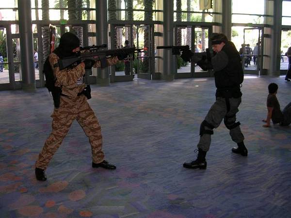 Here's another photo of us posed. I guess I am providing covering fire for the sniper while we make a stand against the oncoming ghouls. He's taking long shots with his PSG-1 while I am taking on closer targets with an MP-5K. We were forced to retreat soon after this photo...
