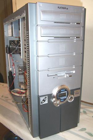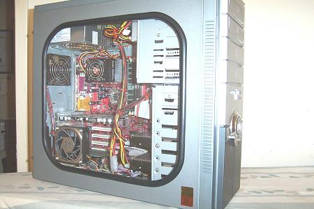 When I brought it home, it's removable side panels were solid metal. Pictured above it has the left side panel removed but you could not see in without removing that panel. I had read about modifying your own case and decided to give it a shot. At the local hardware store I bought piece of "Lexan", ordered some window molding from a 'case modding' website and cut a huge hole in the left panel.