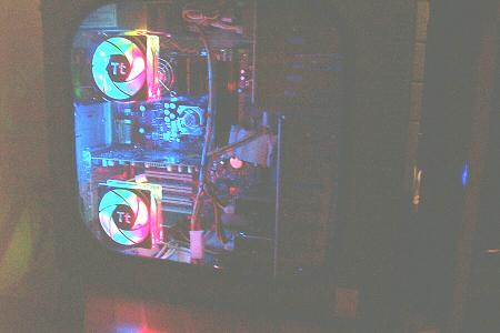 This is how the window looks now, except for the CPU heatsink and fan. I replaced the stock Thermaltake heatsink and fan with a ThermalRight SLK-800 and an 80 mm fan that has blue LED lights. Now it is even brighter on the inside. This picture is taken in the daytime with the blinds closed. It looks better and brighter at night. That still wasn't all I had in mind so I set to work again. If you look at the first picture above you can see that the front of the case was pretty plain and there is a nice open dark colored area near the bottom front just under the temp. gauge and power buttons. Here I cut another hole right through the plastic 'bezel' and the metal grillwork under it. This hole provides and open airflow for a fan I mounted inside. The fan provides extra cooling for the entire case but also blows directly over the two hard drives (keeping them cool) mounted on the rack in the lower front of the case. To decorate this fan, I glued a plastic spinner from a model airplane propeller. Then I inserted a cut to length piece of 3" PVC drain pipe into the hole I had cut and glued everything in place and painted it all black. I custom made a light ring using L.E.D. lights and a piece of plastic rod that you spin to open and close venetian blinds. I heated the plastic rod and wrapped it around a small can, (when it cooled it hardened and just fit perfectly into the 3" pipe), cut the ends and inserted the LED lights to light it up. Then, by filing notches in the plastic, the rod refracts the light and looks nice when lit up.
