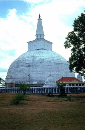 Ruwanveliseya dageba ( stupa) 300 ft. in diameter was constructed by King Dutugemunu (167-137 BC), but he was unable to complete the work on the dageba. Broad flights of steps are found at the entrance of the sand strewn courtyard of the dagoba. The retaining wall was covered with figures of elephants in frontal aspect represented as standing cheek by jowl. At the four cardinal points of the dageba are four "vahalkadas" (frontispieces) which have preserved some very old sculptures.
