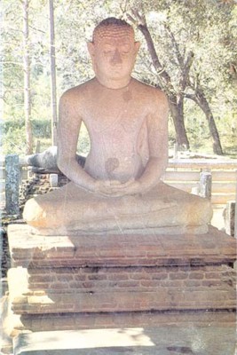 The granite rock statue is 7’3" in height, date back to the 4th century, shows the Buddha in a state of deep meditation , was found in 1888, with the nose damaged. Raven Hart in his "Ceylon - History in Stone" says that the repaired nose is oversharp and overlarge. The statue has had two jewels for the eyes which are said to have gone missing in around 1914. The canopy over the statue was constructed in 1959-1960. This perhaps is the world's best Buddha image so far discovered. The unsophisticated simplicity, calm strength and fortitude characterize the face of the Anuradhapura Buddha. The majestic seriousness of the face commands awe and respect.