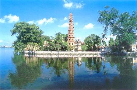 Trấn Quốc ( means National Founder) is the oldest temple in Hà Nội. It was constructed in the 6th century during the reign of King Lư Nam Đế and was named Khai Quốc ( means "founding the country") which sat on the bank of the Red River but was moved to the island in the West Lake during the reign of King Lê Kinh Tông (1600-1618) on an island in the West Lake. One of the present statues inside the pagoda was fashioned in 1639. Trấn Quốc is also an active monastery.