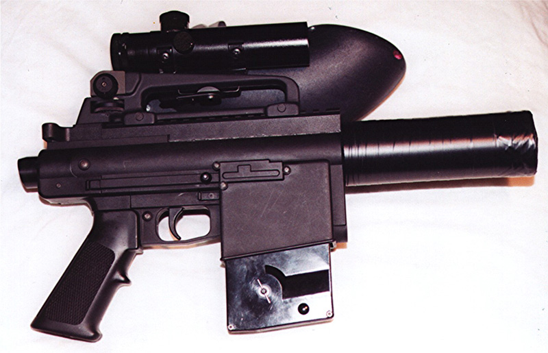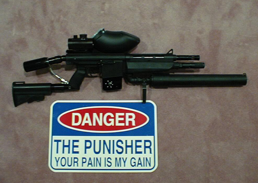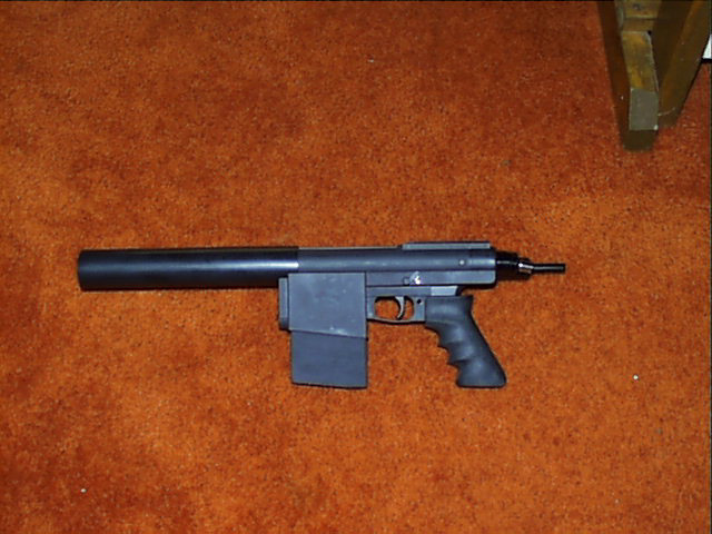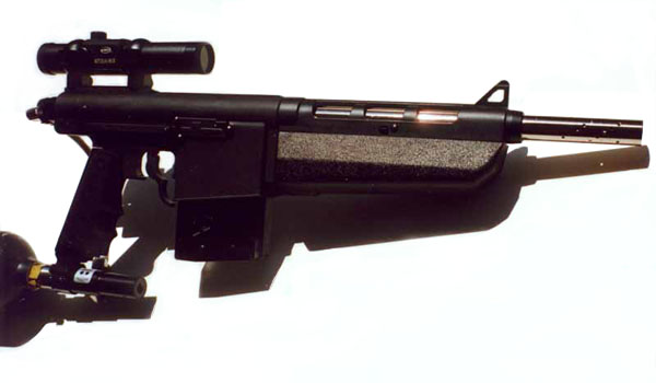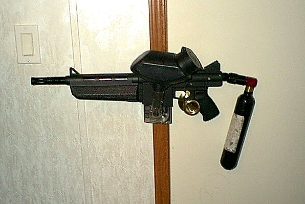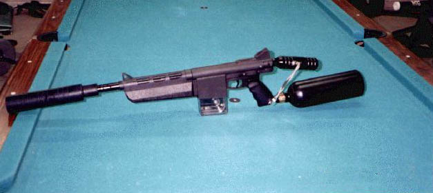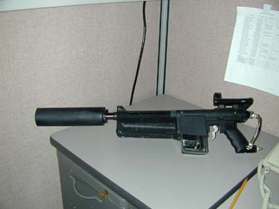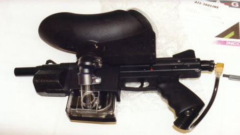 Paul Sedler's "Mini Gun" - This pic was taken by Rocky Grismore. For those of you who do not know Paul, he was the Production Manager at Tagline's West Coast office. Paul's gun was displayed during the Zap Amateurs, held in Pittsburgh, Pennsylvania (US). Also featured at the tournament was a cut away "minigun" that showed the working innards. | |