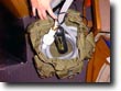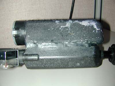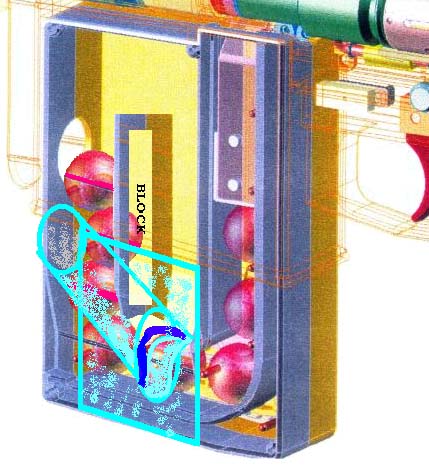 Chris Jarvis, to solve his need to feed more paint into the gun, came up with this mod to the clip so that you can feed more than 10 rounds per second into the gun. The basic viewloader is restrained by gravity and can only feed at rates of only 10rps. But with the TS1, you can fire much faster than this. Chris cut a portion of the viewloader mod within the clip so that balls can feed down from the front loader and onto the chain drive. To prevent possible jamming, he also glued a wall in the clip so that balls coming from the front foregrip feeds directly onto the chain drive. | |
