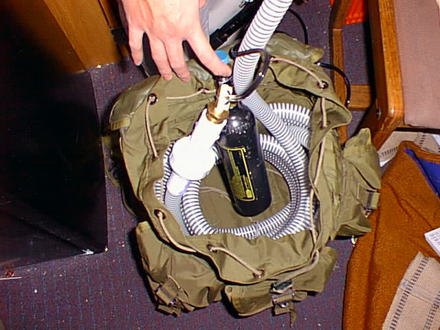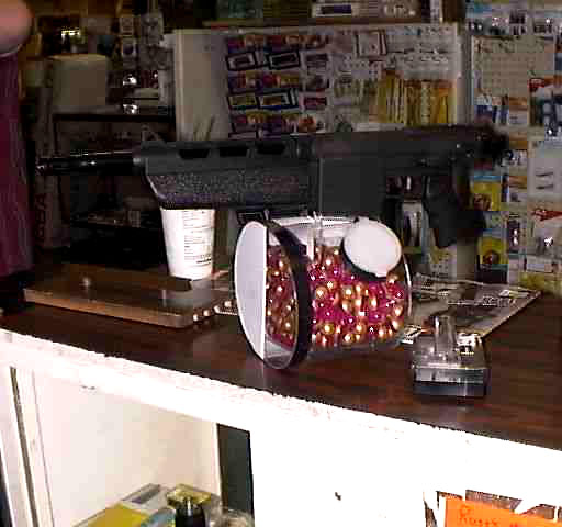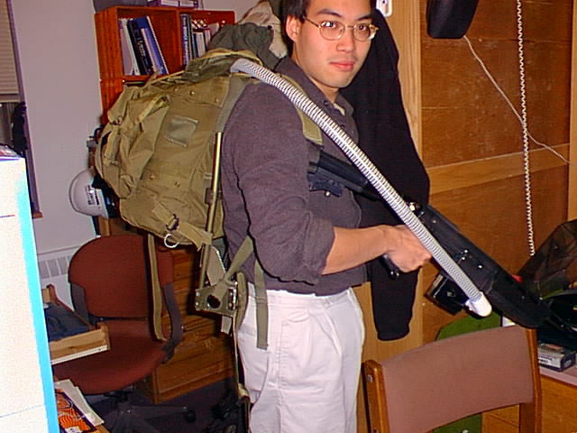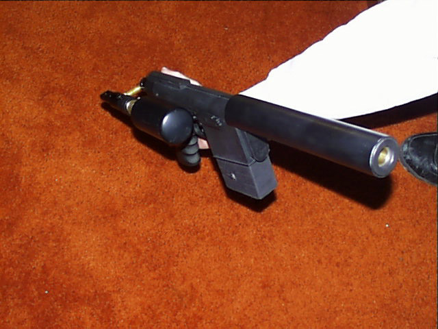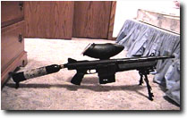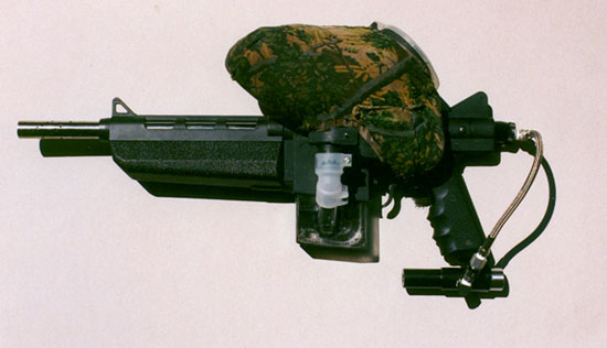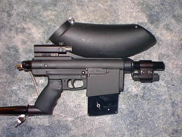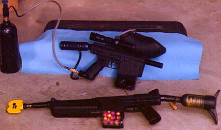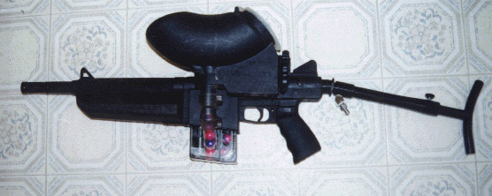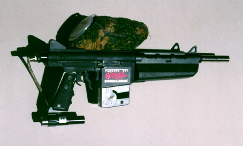 | Trung Chanh Phan Paintballs are stored in a long hose in the backpack (medium alice). Then co2 is turned on via a pushbutton on the fore grip and the balls travel through the hose straight into the clip. Work alright so far. This loader system can hold anywhere from 500-1800 rounds (depending on how much hose you want on your back:). I'm waiting for Rusty's grenade launcher before I permanently attach the switch. As to the feed rate, there are no problems whatsoever in keeping up with the 12-14 rounds that the AT can do in either nitro or co2. I could empty the entire paintball load of 800 in about 30 seconds. email him |