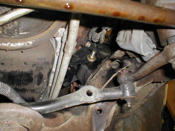 These two pix are to show the modification to the crossmember. The tang the tranny mounts to was cut off and then re-mounted 1/2" lower, and 1/2" forward. This allowed the tranny to sit at the proper pinion angle since the tranny is longer than the 350 Turbo, and no modification or pounding on the tranny tunnel was needed for clearance. Notice in the first picture, the mounting bolts are perfectly centered in the slotted mount holes, in case of later mishaps. Some minor modification was needed for the shifter linkage to use the column shifter, but it works fine now.