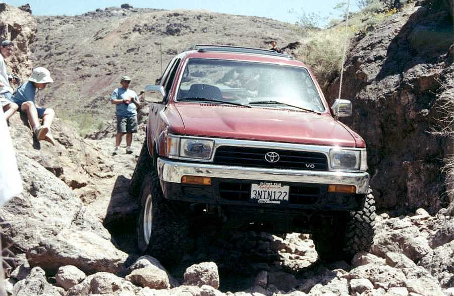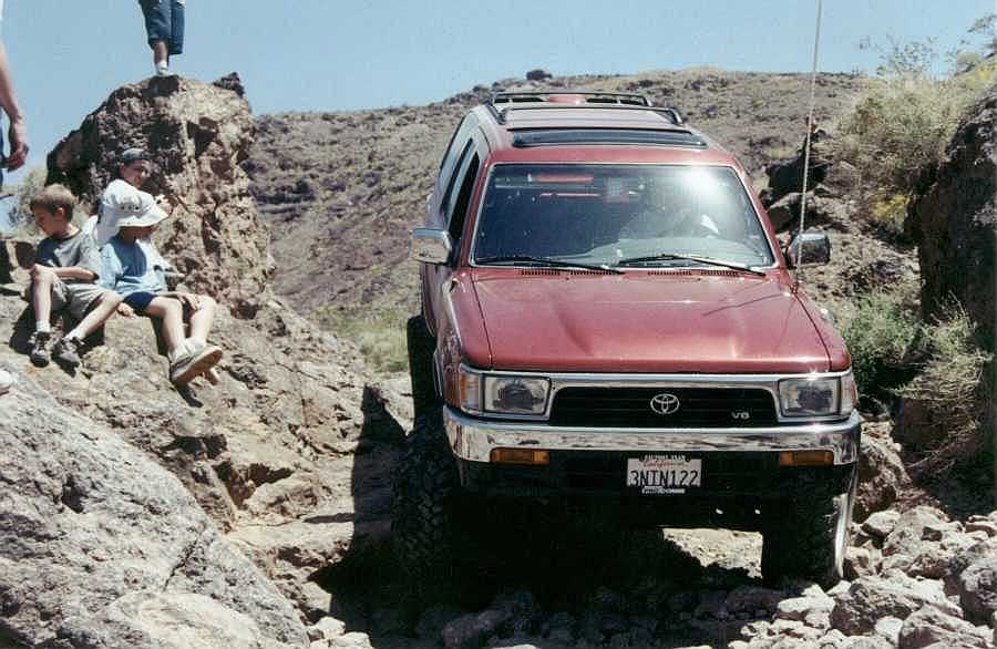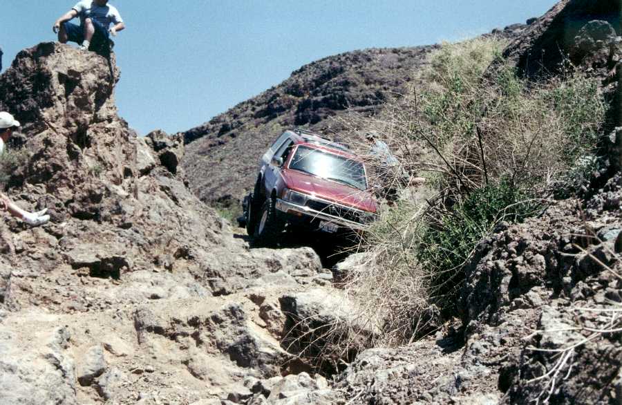 The next 4 pictures are in sequence of my truck flexing down the steps. Notice John helping me push the truck in case it wants to tip over. Next Back to home page