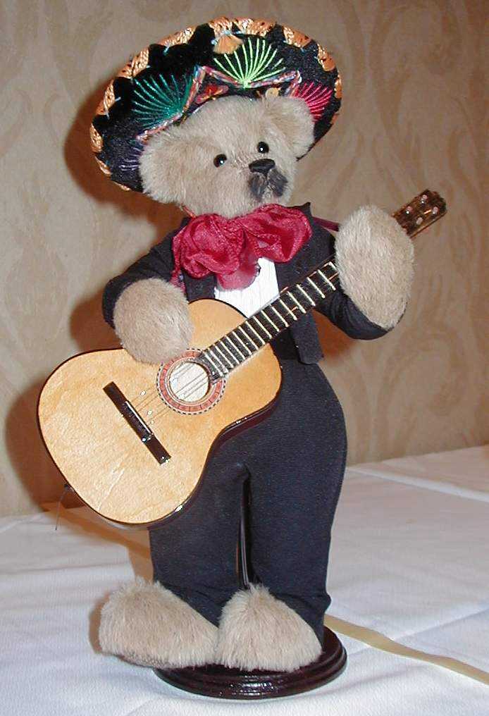 | This wonderful Mariaci Player with his guitar is 13 inches tall. He was specially made for the San Jose Convention 2000, in which he took First Place. He's made of mohair, ultra suede paws, and German Glass eyes. His outfit is handmade and the guitar is a collectable item also. |