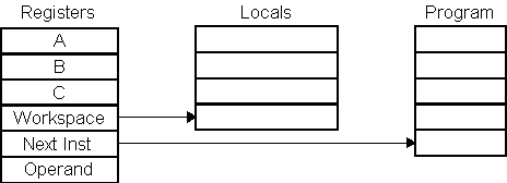 Existen tres registros adicionales que son usados por el microprocesador con las finalidades de puntero al espacio de trabajo (workspace), apuntando a la zona donde son guardadas las variables locales; puntero de instrucción (next inst), que apuntaría a la siguiente instrucción que será ejecutada; y el registro de operando (operand).