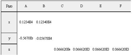 La siguiente tabla muestra los pasos necesarios para realizar esta suma. Los números que se van a sumar son el x = 11234.00 y el y = -567.8. A diferencia de la representación habitual, estos números se almacenan en notación decimal con una mantisa de cuatro dígitos.