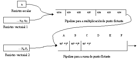 La figura 1 muestra el diagrama de funcionamiento de un único pipeline. Como indicamos anteriormente, la mayoría de las arquitecturas vectoriales tienen más de un pipeline, y en muchas ocasiones presentan distintos tipos de pipelines.