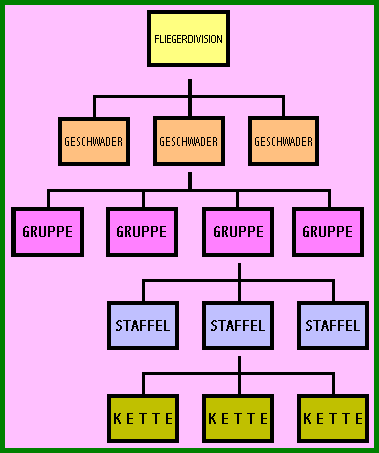 | 2 nci Dünya Savaşı'nın başında hava ordusuna ait uçuş birlikleri iki veya üç hava tümeni biçiminde örgütlenmiştir. FLIEGERDIVISION ( çoğulu FLIEGERDIVISIONEN ), komuta zincirinde hava filosunun üzerindeki basamak olmasına rağmen çoğunlukla atlanmıştır. Savaşın sonlarına doğru, Kuzey Fransa'da olduğu gibi bir bölgeye yayılmış bütün avcı uçaklarını kontrol etmek maksadıyla avcı tümenleri oluşturulmuştur. |