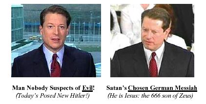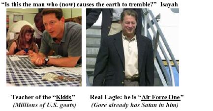 "VICE" PRESIDENT ALBERT GORE, JR. (666 man of blood) the "LAST LITTLE HORN", the "EVIL CHILD" of Satan: THAT MAN, the GREAT EAGLE GOD'S SON from the East [ISAIAH 46:10-11]. HE IS "WHAT WAS, and IS, but IS NOT, and YET IS" and "HE is of the SEVEN and HE IS the EIGHTH" (Last Abba-don-Apollyon Lion-Goat King over the evil workers in Revelation)