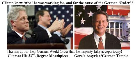 Clinton knew 'who' he was working for, and for the cause of the German 'Order' * Thumbs up for their German World Order that the majority fully accepts today! Clinton: His 33rd. Degree Mouthpiece Gore's Assyrian/German Temple