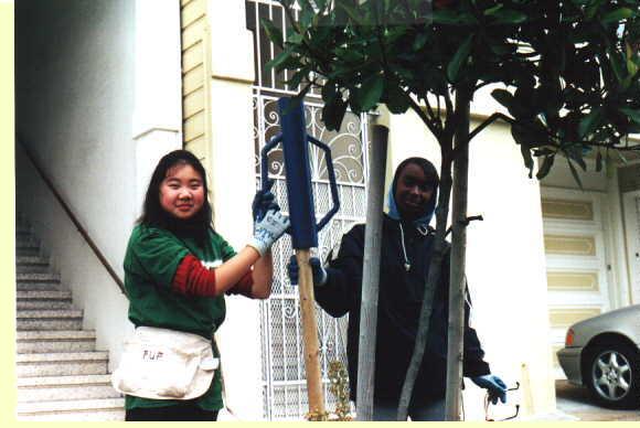Catherine and Bianca team-up to re-stake a Raphiolepis tree.