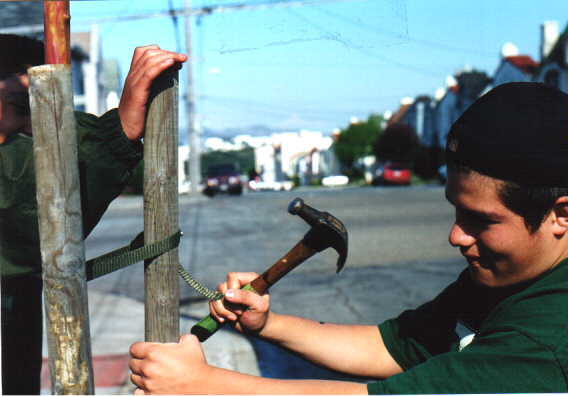 René hammers the arbor tie onto the stake while Fidel holds the stake from behind. The young Strawberry tree (Arbutus unedo) is behind the stake on the left.