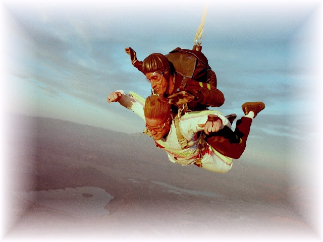 Here is a picture of me skydiving. I am the guy in front with the blonde hair.