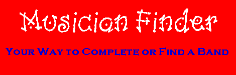 Welcome to the first site design for the musician to meet their match. Here at Musician finder, our goal is for bands to find the musicians they need, and for musicians to find the band they want. Find the link at the left which suits you. For example: If you are a guiarist looking for a band, go to the "Guitarist" section and post an ad about yourself. Include all info that people would need; including name, location (City/State), instrument, age, musical inspirations, experience, e-mail address, and anything else you would like everyone to know. Please be serious musicians, who are willing to be dedicated to the band or persons you are interested in.