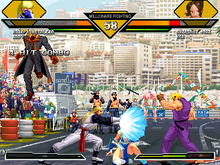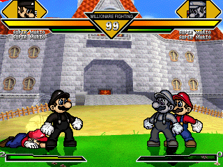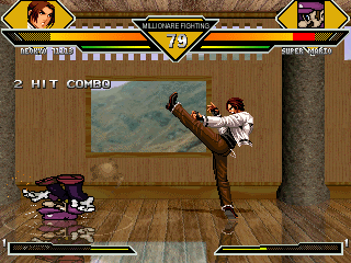 Kyo kicks Mario onto his head.