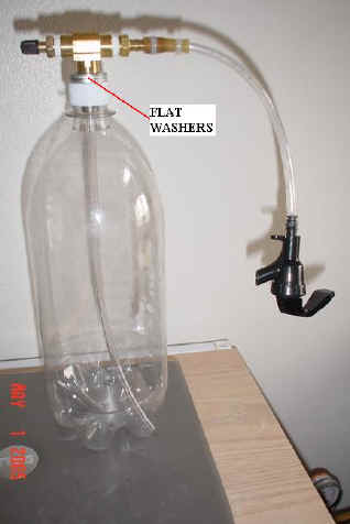 -The seal is made by tightening the 1/4" NPT Female Tee. Since the Tee cannot tighten all the way down to the cap, it is necessary to insert washers as shown in the picture. When the Tee is tightened, it puts pressure on the O-ring (inside the cap), between the inside of the bottle cap, and the 1/4" stainless steel hex nipple. (Use a stainless steel hex nipple so that you do not contaminate the soda)