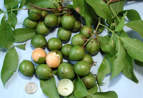 The ginup is in the Soapberry Family. It is a familiar exotic tree planted for its edible fruit and shade. Individual fruits are ovoid in shape, an inch or more long. Fruits have a thin, brittle skin, and are borne in clusters. A thin layer of tart to sweet pulp, which is gelatinous and slightly fibrous, yellowish to salmon colored, and suggestive of grapes, covers a large seed. The seeds are edible after roasting. Besides furnishing fruit and shade, the trees are honey plants. Description The mamoncillo tree is slow-growing, erect, stately, attractive; to 85 ft (25 m) high, with trunk to 5 1/2 ft (1.7 m) thick; smooth, gray bark, and spreading branches. Young branchlets are reddish. The leaves are briefly deciduous, alternate, compound, having 4 opposite, elliptic, sharp-pointed leaflets 2 to 5 in (5-12.5 cm) long and 1 1/4 to 2 1/2 in (3.25-6.25 cm) wide, the rachis frequently conspicuously winged as is that of the related soapberry (Sapindus saponaria L.). The flowers, in slender racemes 2 1/3 to 4 in (6-10 cm) long, often clustered in terminal panicles, are fragrant, white, 1/5 to 1/3 in (5-8 mm) wide, with 4 petals and 8 stamens. Male and female are usually borne on separate trees but some trees are partly polygamous. The fruit clusters are branched, compact and heavy with nearly round, green fruits tipped with a small protrusion, and suggesting at first glance small unripe limes, but there the resemblance ends. The skin is smooth, thin but leathery and brittle. The glistening pulp (aril) is salmon-colored or yellowish, translucent, gelatinous, juicy but very scant and somewhat fibrous, usually clinging tenaciously to the seed. When fully ripe, the pulp is pleasantly acid-sweet but if unripe acidity predominates. In most fruits there is a single, large, yellowish-white, hard-shelled seed, while some have 2 hemispherical seeds. The kernel is white, crisp, starchy, and astringent. Origin and Distribution The mamoncillo (ginups)is native to Panama, Colombia, Venezuela, and the island of Margarita, also French Guiana, Guyana and Surinam. It is commonly cultivated and spontaneous in those countries, also in coastal Ecuador, the lowlands of Central America, the West Indies and in the Bahamas. In Florida, it is occasionally grown as far north as Ft. Myers on the West Coast and Palm Beach on the east; is much more plentiful in Key West, especially as a street tree. There are some specimens in California and in botanical gardens in the Philippines, Zanzibar, Hawaii and elsewhere. According to Britton, there was a tree about 30 ft (9 m) tall in Bermuda in 1914 but it had never bloomed. There are a few trees in Israel but none has flowered before 10 years of age. Pollination Generally, the presence of a male tree is necessary to pollinate the flowers of trees that are predominantly female (or hermaphrodite functioning as female). However, in Cuba, some trees have sufficient numbers of flowers of both sexes to yield regularly large crops without interplanting.