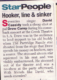 From this little note you can see how much you can trust the Star Magazine (August 8, 2001). Witnesses said after the show that David was joking with a lot of people. The spotlight was put on Drew Carey and his date, and they were both laughing. They stayed the whole show, and supposedly he had been spotted at the party afterwards as well. I wonder where Star gets their information from. Also noted, Burger King got a new commercial in the US. The song played in the commercial is "I woke up in love this morning" performed by The Partridge Family. |