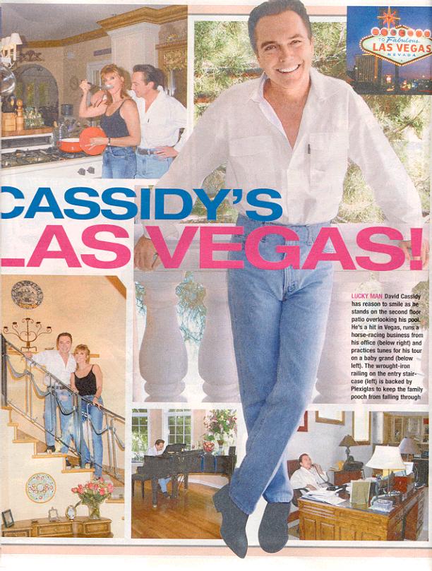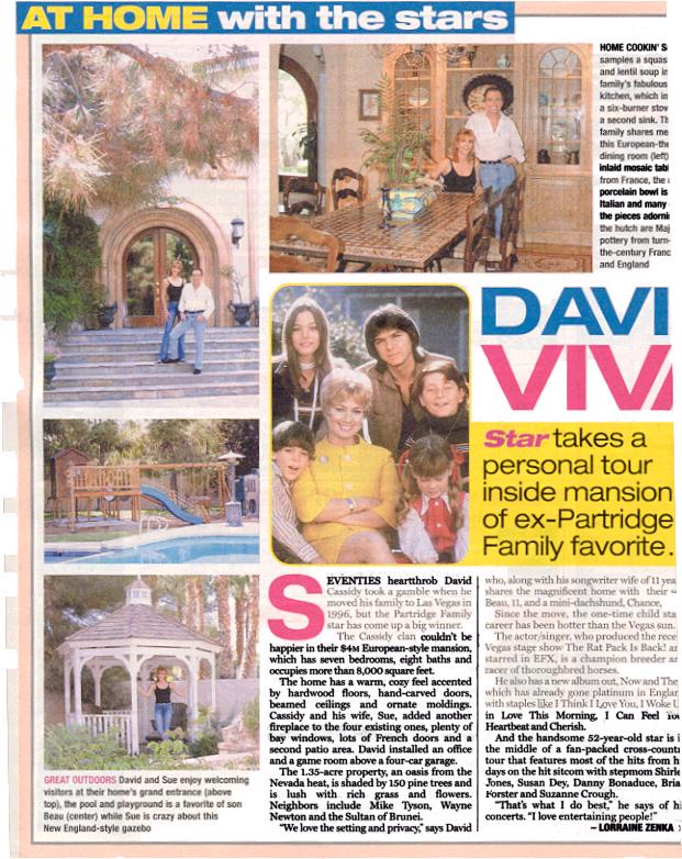 The Cassidy clan couldn't be happierin their $4M European-style mansion, which has seven bedrooms, eight baths and occupies more than 8,000 square feet. The home has a warm, cozy feel accented by hardwood floors, hand-carved doors, beamed ceilingsand ornate moldings. Cassidy and his wife, Sue, added another fireplace to the four existing ones, plenty of bay windows, lots of French doors and a second patio area. David installed an officeand a game room above a four-car garage. The 1.35-acre property, an oasis from the Nevada heat, is shaded by 150 pine trees and is lush with rich grass and flowers. Neighbors include Mike Tyson, Wayne Newton and the Sultan of Brunei. "Welove the setting and privacy," says David who, along with his songwriter wife of 11 years, shares the magnificent home with their son Beau, 11, and a mini-dachshund, Chance. Since the move, the one-time child star's career has been hotter than the Vegas sun. The actor/singer, who produced the recent Vegas show The Rat Pack Is Back! and starred in EFX, is a champion breeder and racer of thoroughbred horses. He also has a new album out, Now and Then, which has already gone platinum in England with staples like I Think I Love You, I Woke Up in Love This Morning, I Can Feel Your Heartbeat and Cherish. And the handsome 52-year-old star is in the middle of a fan-packed cross-country tour that features most of the hits from his days on the hit sitcom with stepmom Shirley Jones, Susan Dey, Danny Bonaduce, Brian Forster and Suzanne Crough. "That's what I do best," he says of his concerts. "I love entertaining people!" Lorraine Zenka