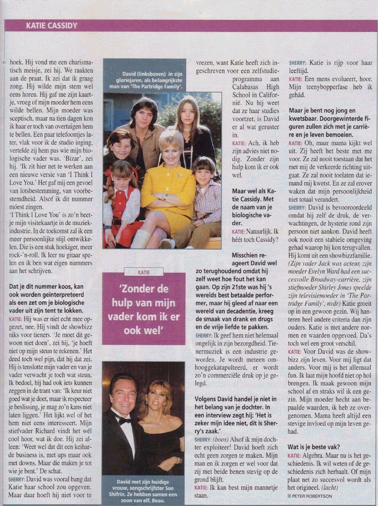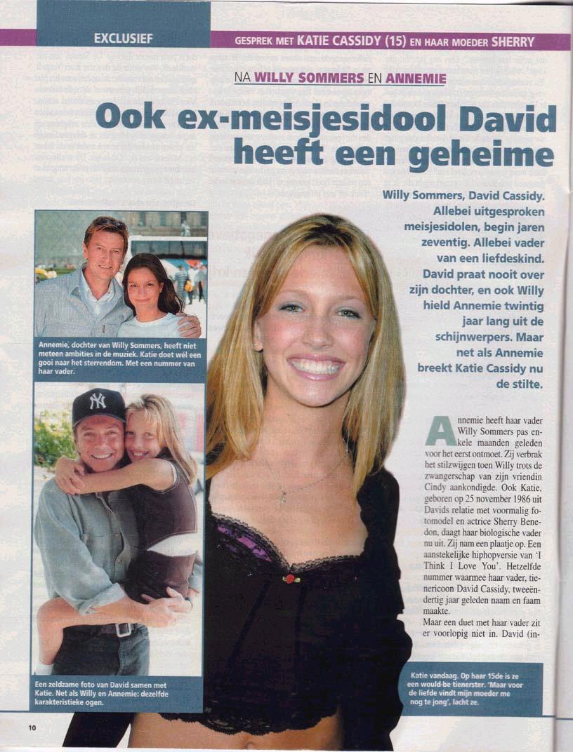Willy Sommers, David Cassidy, both teen idols at the beginning of the seventies. Both father of a lovechild. David never talks about his daughter, and also Willy kept Annemie out of the spotlights for twenty years. But just as Annemie Katie Cassidy speaks up. Annemie met her father only recently for the first time. She broke out of silence after Willy announcing the pregnancy of his girlfriend Cindy. Also Katie, born on November 25, 1986 from David’s relationship with the former model and actress Sherry Benedon, carries out her biological dad. She recorded a cd. A catching hip hop version of “I think I love you”. The same song that took her father , teen idol David Cassidy thirty-two years ago to stardom. But a duet between them is not for the near future. David (52 by now) is on the contrast to Willy Sommers not yet into much contact with his lovechild. On and off relationship David Cassidy stole the hearts of mass of teenagers in the popular tv-series “The Partridge Family”. When he in 1971 went on a solo tour the mass hysteria reached unknown heights. Ten thousands fanatical girls who shouted out their love for him. His longing voice, his boyish face made David Cassidy the subject of their fanatical devotion. In 1970 Sherry did an audition for a part in the Partridge Family. “I didn’t get the part”, she says but David did ask me out that same night. He was so sweet and charming I was no longer interested in that role. I was only interested in that beautiful boy. Sherry was never married to David. She supported during the seventies and eighties an off an on relationship with the icon. A period in which he was married two times. With actress Kay Lenz and with Mary-Ann Tanz. And she one time. With Dean, the father of her two daughters Jaime and Jenna. I was divorced from Dean when I got pregnant with