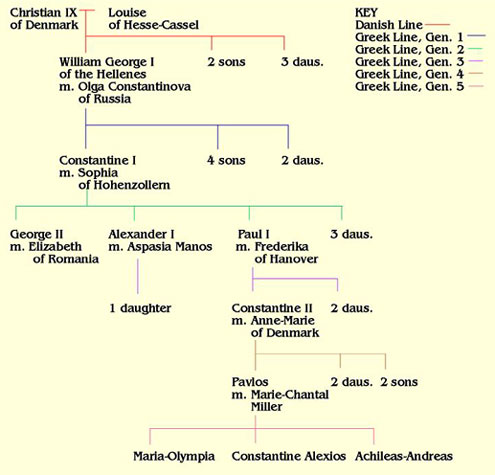 Notes on Chart 1King William George I* was born in 1845. He was offered the Greek throne in 1863, and became King George I. He and Queen Olga** had seven children: King Constantine I, Prince George, Princess Alexandra, Prince Nicholas, Princess Marie, Prince Andrew, and Prince Christopher. He reigned until 1913, when he was assassinated. King Constantine I succeeded George I in 1913. He was a very unlucky monarch who ruled briefly twice. He was deposed in favor of his son Alexander I in 1917. Upon Alexander I's death in 1920, he was King once more, but was forced to abdicate in 1922 in favor of his eldest son, George II. He died in exile later that year. He and Queen Sophia had six children- three of whom became King- King George II, King Alexander I, Princess Helen, King Paul I, Princess Irene, and Princess Catherine. King George II reigned after Constantine I was forced to abdicate in 1922. He was ousted in 1924 when a plebiscite abolished the monarchy, but was restored to the throne in 1935- when another plebiscite brought it back. In 1941, he took his government into exile because of the Nazi attack, but was restored to the throne in 1946. He and Queen Elizabeth, who divorced in 1935, did not have children. He died in 1947, and was succeeded by his brother Paul I. King Alexander I reigned briefly from 1917-1920. He married a Greek commoner, Aspasia Manos, in 1919; the union was considered controversial by the Royal Family, the Church, and the Greek people. In 1920, he died from blood poisoning that came from a pet monkey biting him. His daughter Princess Alexandra, born posthumously, is the only member of the Greek Royal Family with Greek blood. King Paul I succeeded George II. He was a known as a decent monarch, but was unpopular in part because of anti-German sentiment directed against Queen Frederika, a Princess of Hanover. They had three children: the present Queen Sofia of Spain, King Constantine II, and Princess Irene. He died in 1964. King Constantine II succeeded his father in 1964. A military coup occurred in April 1967; he left in self-imposed exile In December. In 1974, a referendum, which some claim was fixed, formally abolished the monarchy. He has resettled in London and continues to fight the Greek government for confiscated Royal properties and his family's citizenship. He and Queen Anne-Marie have five children: Princess Alexia, Crown Prince Pavlos, Prince Nikolaos, Princess Theodora, and Prince Philippos. *I have listed King George I of Greece as "King William George I" in my diagram in order to list both his birth and accession name. Several genealogy sites also list him as "William George I." **An amusing anecdote about Queen Olga occurred during King George V of Britain's reign. The King, who was a simple man, reportedly thought little of his wife Queen Mary's collection of objets d'art- with the exception of a small figurine of Lady Godiva. Queen Olga, who was very nearsighted, supposedly peered closely at the figurine, and said, "Ah, dear Queen Victoria." |