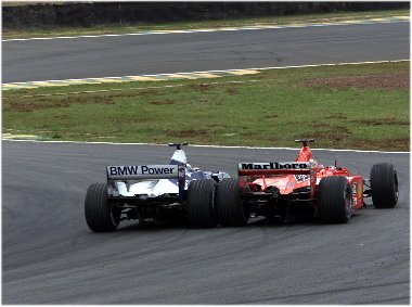 At your home Grand prix you expect a bit of good luck don’t you? well Rubens Barrichello’s fans had high hopes of him winning the race. Before the race had even began he was in trouble. He had to run back to the pits, get in the spare car which was set up for Michael and get out of the pit lane before it closed. He did it, with only 30 seconds to spare. He probably felt it was pointless after the race because he slammed into the back of Ralf Schumacher with only a handful of laps gone. This didn’t please Ralf too much either as he had to pit for a now rear wing which left him four laps down. The Williams used it a race test session. Ralf, on a one stop fuel load made the fastest lap of the race, showing just what he could have done if Rubens hadn’t slammed into him.