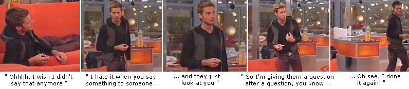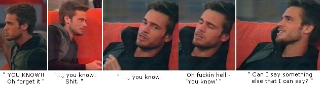 But another thing, with this task tonight as well, I just hope that after everything that's happened today, we can just forget about all the arguments we've had, you know... And I keep on saying 'you know', that's another thing people keep picking me up on, I keep on saying 'you know' - and that's starting to anger me as well. I'm starting to piss myself off, that's what I can't believe now, cos I'm nagging all the time. But I don't... but I'm not... I’m... Buuuhh!!