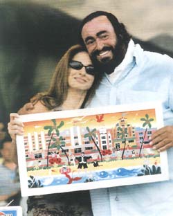 When Gloria Estefan traveled to Italy in June to sing with Pavarotti, she took a special gift she would be presenting to Pavarotti from the city of Miami Beach. The gift was a painting by Herbert Felic Hofer, an internationally famous South Beach artist. The painting commemorates Mr. Pavarotti's concert on South Beach in 1995. It is the city's invitation to Pavarotti to return to South Beach to perform, this time with our favorite diva, Gloria Estefan. In the painting are several of South Beach's famous Art Deco buildings, including the Estefans' Cardozo Hotel and the 1390 Ocean Drive condominium where Hofer lives. |