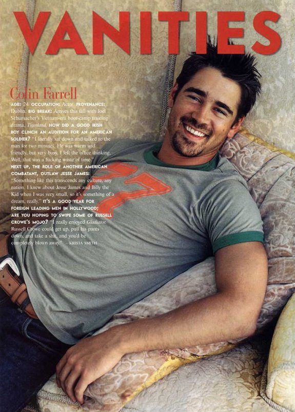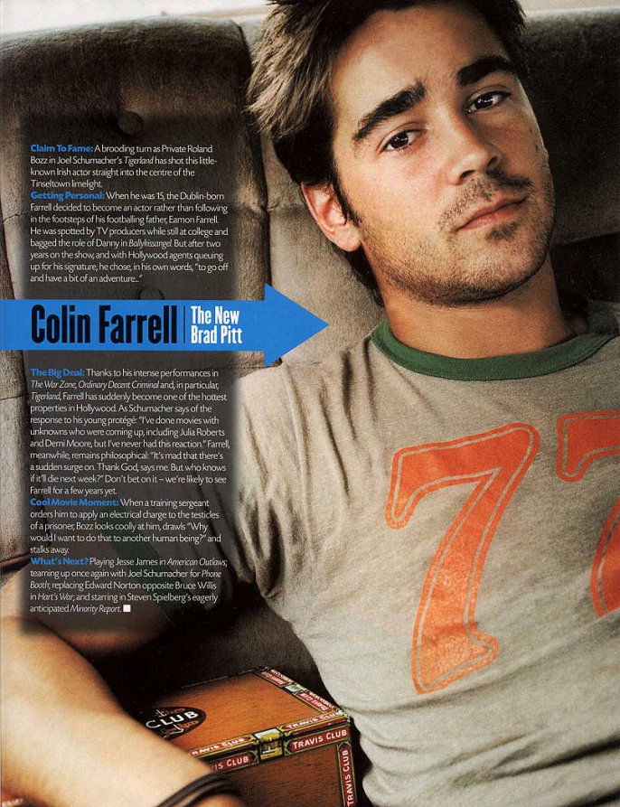 Colin Farrell Colin Farrell, the bad boy of Hollywood who is rarely seen without a cigarette or beer. While those are definite turn-offs, his great hair and ability to not look like a hillbilly with that goatee thing bring us crawling back. Colin's had lots of success on picking movies in which his hair doesn't look retarded...but in Minority Report he did have some majorly gelled locks--but not in a good way. But then we see him doing an interview with his hair looking perfect again, and we're hooked again. What is it with those bad boys... Images