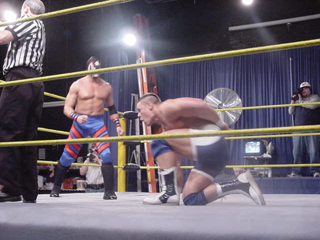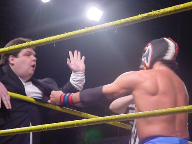 Take THAT Prototype! Back for a single surprise visit, Rico's Inuit type mask did not fool the fans at Ohio Valley Wrestling! Even with the mullett gone and the mask in place, there was no mistaking the distnictive tights and mannerisms of Rico Costantino! The reaction for his return was even more awesome that when he left. At the end of the match, Rico was once again defeated, but Kenny Bolin's briefcase is a little worse for wear! Special thanks to Gail for some of the more awesome shots!