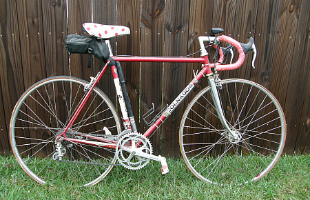 | Photo above shows Cheryl's bright red Colnago Super. The frame was purchased (used) in early March, 1985 and built up with a mixture of Campy and Shimano components. Like my Ciocc it currently features Look clipless pedals, aero brake levers and a cyclocomputer. | ||||||||||||