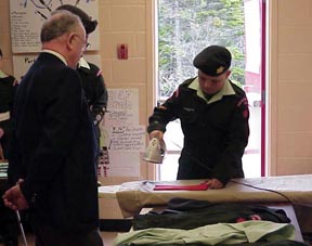 Reviewing Officer LCol Aubrey Halfyard observes a demonstration of how to press the uniform. |