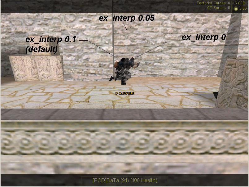 some screenshots to explain the difference between different ex_interp settings. The test was made as follows: I started a LAN-game with POD-bots and went in as spectator. I paused the game with one of the bots clearly visible in the center of the screen. With the game still in pause I changed between different ex_interp-settings and took screenshots. Then I merged the screenshots with photoshop so the difference can be easily compared. Watch the Merged Screenshots |