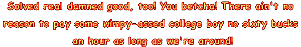 How does it make you feel when your computer locks up just as you're about to get the best "Deer Hunter" score you've ever had? And have you ever gotten to just about half a second away from seeing everything in Britney's inventory when your browser freezes? Well, friend, WE'VE ALL BEEN THERE! And we can really feel for you, too........but, WORRY NO MORE! Let us solve these problems for you! By installing a new SCSI hard drive, DVD RAM, FireWire port, quad CPU cooling fans, water-cooled outboard floppy controller and iridium-plated AGP slot adapter, plus a few top secret tweaks and tricks of our own, we can just about guarantee you that you'll never have another untimely crash ever again! And the most amazing thing about our incredible service is our LOW LOW PRICE! We will improve the stability of your failing and decrepit system for ONLY $179.00 --- that's MUCH MUCH LESS than our closest competition, and A WHOLE LOT LESS than the cost of a new computer! And, in addition to our spectacular upgrade and repair program, we also offer the best in preventative maintenance. For an additional $69.00, we will remove the dangerous and flammable deposits of stray bytes from the inside of your computer case, run our own special proprietary GAR-FED software to permanently guard against re-contamination, and re-torque all of the critical ANSI fasteners throughout your system! You can't beat this offer anywhere! CALL US RIGHT NOW! FROM ALL AREAS, DIAL 1-976-278-9795 TOLL CHARGES MAY APPLY. MINIMUM 10 MINUTE FEE. MUST BE 21 OR OVER REGISTERED WITH THE GOOD BUSINESS ASSOCIATION OF THE DOMINICAN REPUBLIC |