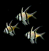 Angelfish are laterally compressed or look like a disc on edge with long fins coming out of the top and bottom and have 2 'feelers' in front of the anal or bottom fin. The tail is vertically oriented and may be ffrom scoop shovel shape to long and relatively narrow depending on the variety.