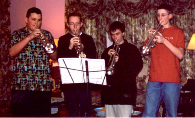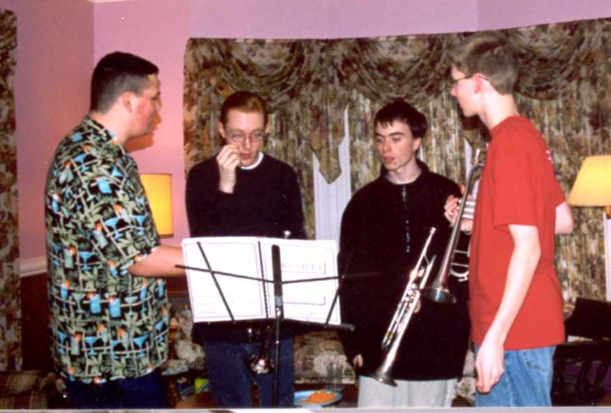 Mike, Matt, Pat, and Me playing our trumpets at my house. |