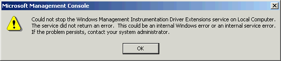 Windows Management Instrumentation Driver Extensions. Provides systems management information to & from drivers. This should be set to Automatic as it seemingly gets Started even if you set it to Manual. Setting it to Disable (Or attempting to Stop the service) will display the following error window.