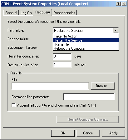 Restart the Service. Windows 2000 will attempt to re-initialize the Service in the event of it failing. Upon selecting this option you may set the amount of time (In minutes) that you wish the service to be re-initialized in the Restart service after field.