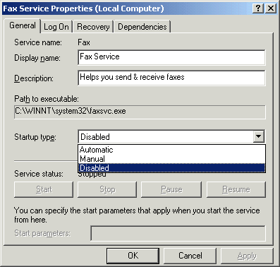 Disabled. This sets that the Service is not started while loading Windows 2000. If it is needed it cannot be started either until you set the Startup Type to Automatic/Manual & Reboot, or Start the service. This will help decrease boot time.