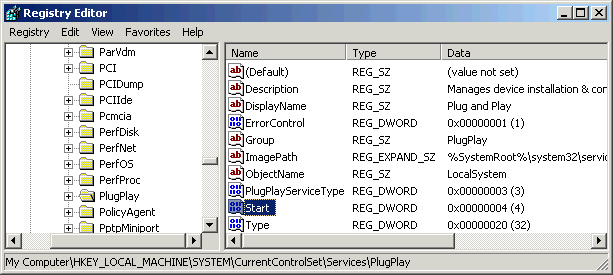 This following example illustrates how you would go about restoring the Plug & Play Service from Disable to Automatic. As you can see in the [HKEY_LOCAL_MACHINE\SYSTEM\CurrentControlSet\Services\PlugPlay] key the value for Start is to 4, i.e. Disabled.