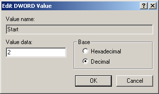 Should you find that you inadvertently Disable a Service that is required to load Windows 2000, or for it to function correctly do the following (Assuming that the Services Utility will not load, which can occur when some Services are set to Disable. Click on Start, Run, type in regedit & hit Enter. Open the following registry key, [HKEY_LOCAL_MACHINE\SYSTEM\CurrentControlSet\Services]. This is where the Startup type for every Service is also stored. Select the appropriate Service (If unsure check the DisplayName value in the Right hand pane) from this subfolder. In the Right hand pane there will be a DWORD value entitled Start. The value (Decimal or Hexadecimal) for this entry determines the Services Startup type, as in the previous section. To change the value Right click on the entry & select Modify. Valid values are as follows;
