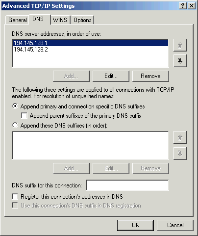 In this tab Untick Append parent suffixes of the primary DNS suffix & Register this connection’s addresses in DNS, as shown in the picture below.