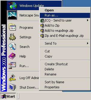 For example, to use the RunAs service with WindowsUpdate - Click on Start, hold down the Shift key, Right click on WindowsUpdate & click RunAs, then Run the program as BACKUP/Administrator. For security purposes you would be best advised to set this to Disable, particularly on systems which are accessed by multiple users & you don't want the risk of them guessing an Users password with Administrative privileges necessary to perform certain tasks.