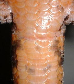 Of course in order to breed blue-tongues, you will need to know the sex of the animals. The easiest and most reliable way would be to place the animal with one of known sex and watch their interaction. However, for some this is not always possible. BT's are famous for being extremely difficult to sex visually. While this is true, there are some slight differences between males and females, that with practice, recognition of these is possible. Head size: This is perhaps the attribute that is most commonly mentioned when sexing BT's. Truth be told, this is also one of the more unreliable physical characteristics. Males do generally have a wider head than females, however, the differences between various animals and species are usually to slight to be accurate. Body shape: Again, helpful, but not an accurate sexing method in and of itself. Males tend to have straighter sides, with females slightly outward bowing at their middles. Again, though, older, heavier males will appear to be females by this method. This brings us to what in my opinion are the more reliable external features of males and females. Hemi-penile bulges: Male blue-tongues are equipped with two separate sex organs. One on each side of its body. These are located in the base of the tail in pockets. Because of this, it is possible to see the bulges created by the hemi-penises. You will notice the difference in the tail base of the two animals below. The picture on the left is a male, and the picture on the right is the female. This feature is more easily displayed during the mating season as the sexual organs swell, and is not visible in baby and juvenile BT's until they reach sexual maturity.